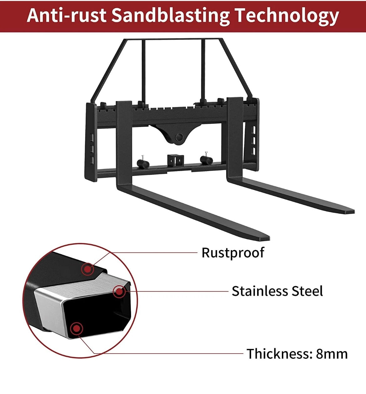 Crafted with premium quality grade 50 steel, the skid steer pallet fork material is a sturdy 8mm thick and boasts a carrying and towing capacity of up to 2500 lbs. The joint use of powder coating and painted finish also grants a robust and smooth surface that offers excellent rust and scratch resistance, providing a long-lasting and reliable solution.